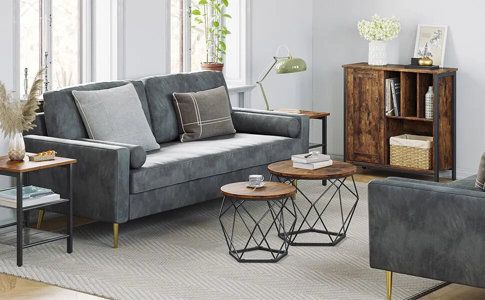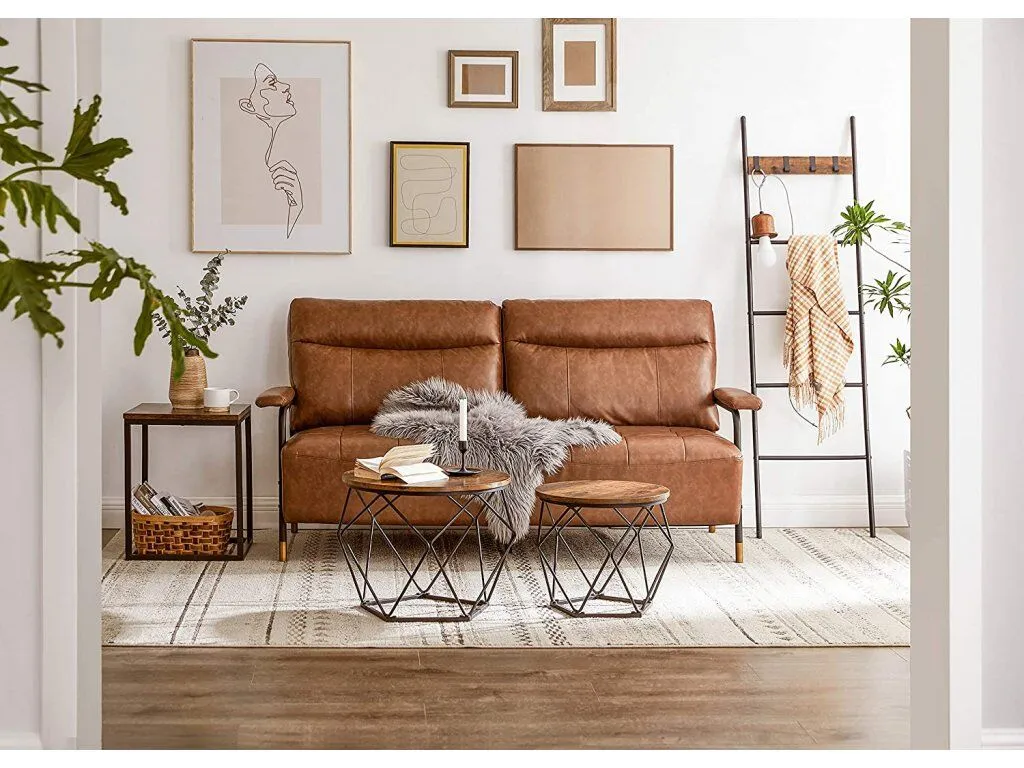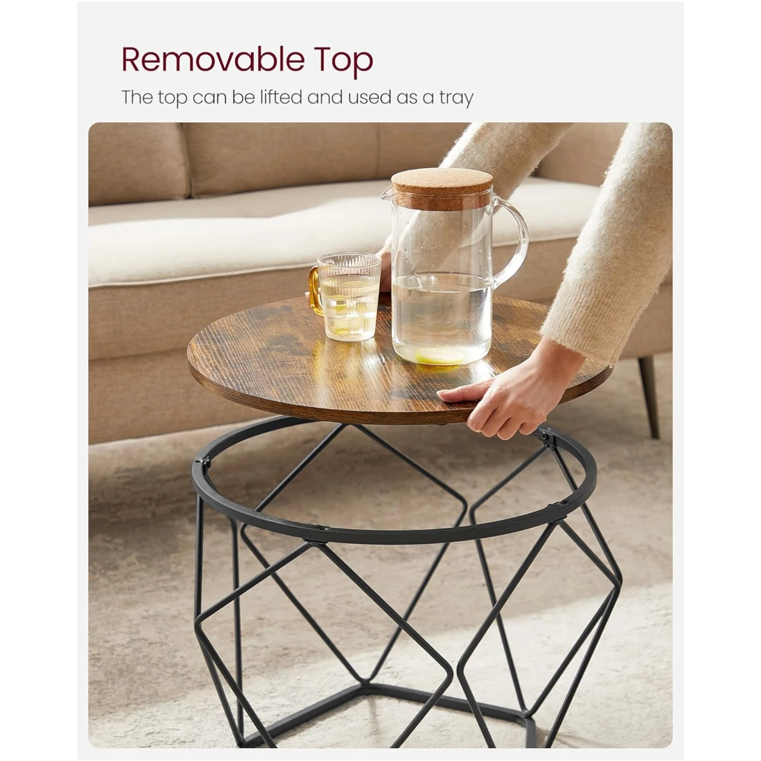 - Сет од 2 клуб маси со модерен индустриски изглед претставен преку рустичните кафеави иверични плочи и црната геометриска метална конструкција, одлично се вклопува во дневна соба, спална, балкон или канцеларија